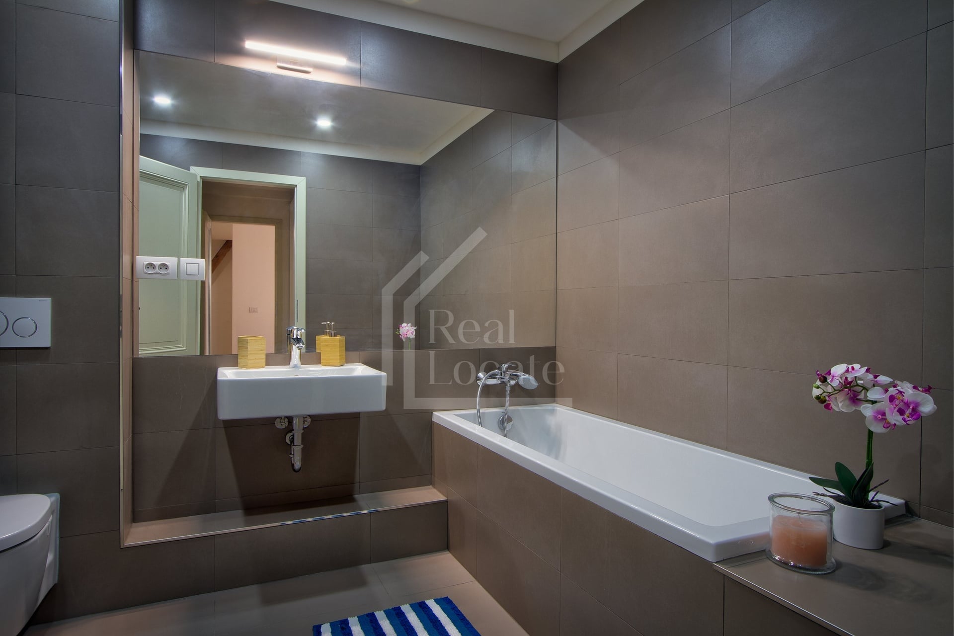 Byt je chytře oddělen na různé sekce - ložnice je přepážkou oddělená od obývacího pokoje a kuchyňského koutu. Koupelna je dostatečně velká s vanou.