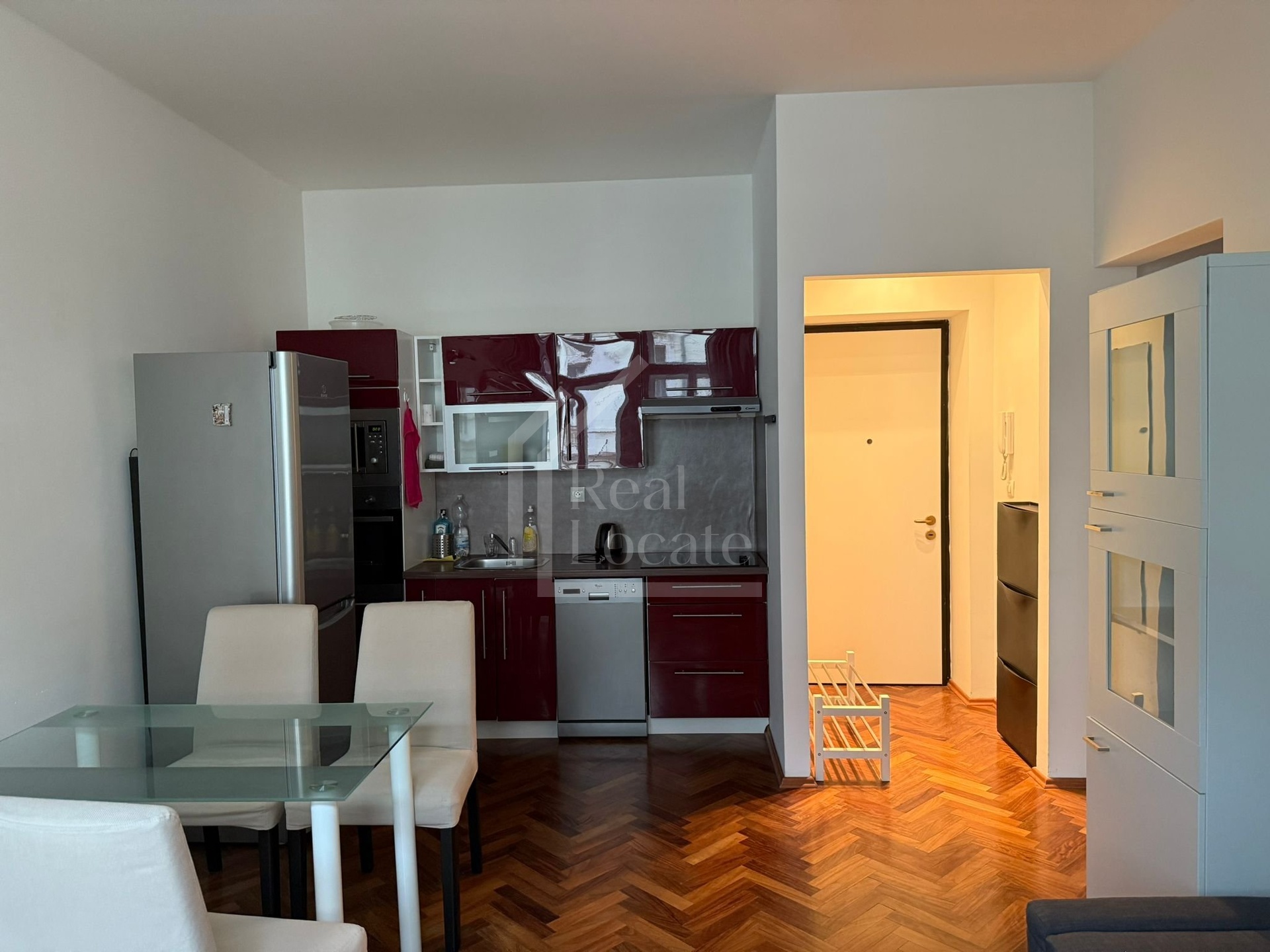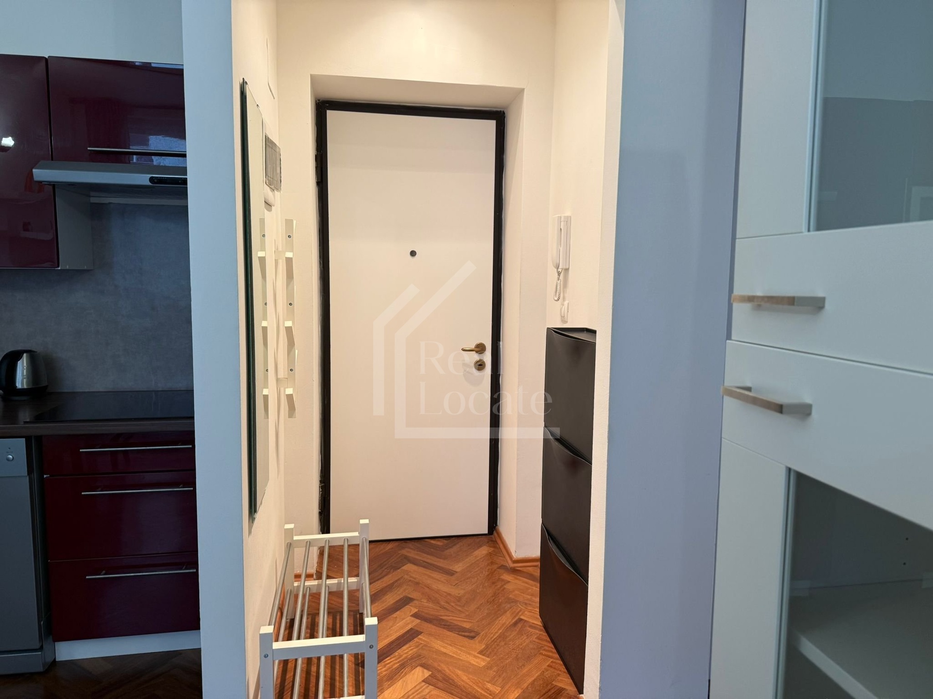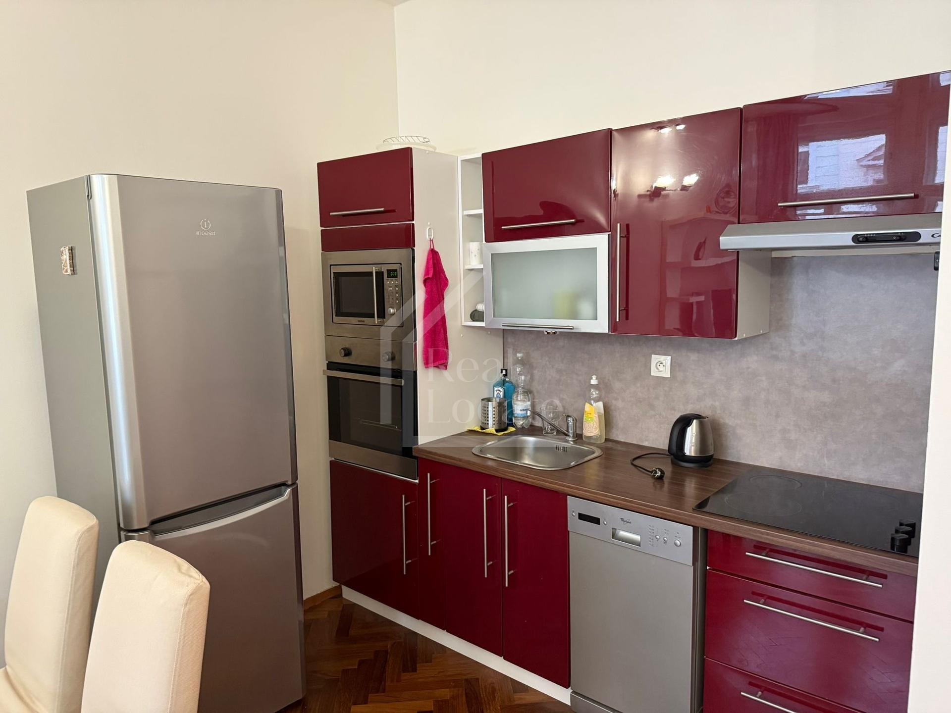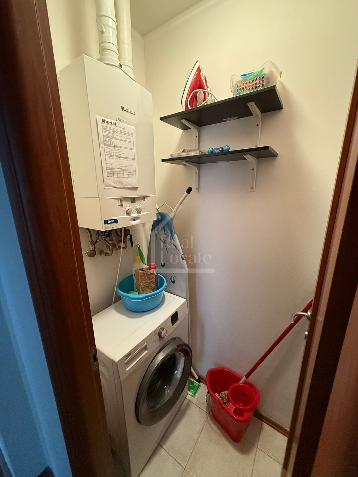 Byt je vybaven vestavěnou skříní, kuchyňskou linkou, lednicí s mrazákem, myčkou, varnou deskou, elektrickou troubou, mikrovlnou troubou, digestoří a pračkou.