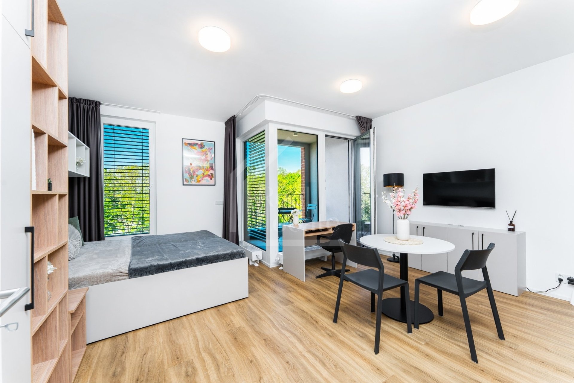 Byt je řešen jako otevřený a světlý prostor s obývací částí a kuchyňským koutem. Dispozice nabízí dostatek místa jak pro bydlení, tak pro pracovní kout. Koupelna je moderní, s kvalitní sanitou. Byt působí velmi vzdušně a je ideální pro jednotlivce nebo pár.