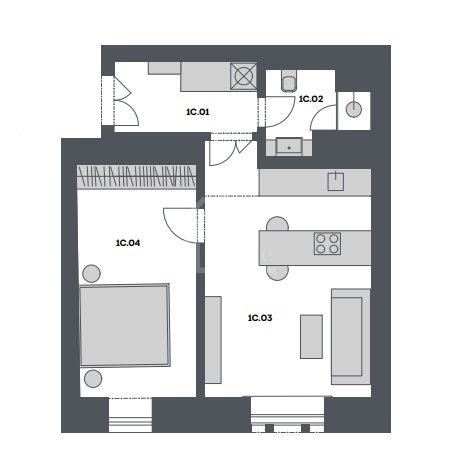 Планировка квартиры включает в себя просторную гостиную с кухонным уголком и обеденной зоной, отдельную спальню, ванную комнату и туалет. В квартире предусмотрено подвальное помещение и возможность выбора более совершенного оборудования, такого как кухня на заказ или встроенные элементы хранения.