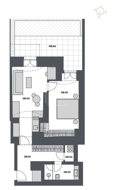 Планировка квартиры включает в себя просторную гостиную с кухонным уголком и обеденной зоной, отдельную спальню, ванную комнату и туалет. Перед квартирой также есть палисадник, который является приятным местом для отдыха. В квартире есть подвальное помещение и возможность выбрать более совершенное оборудование, такое как кухня на заказ или встроенные элементы хранения.