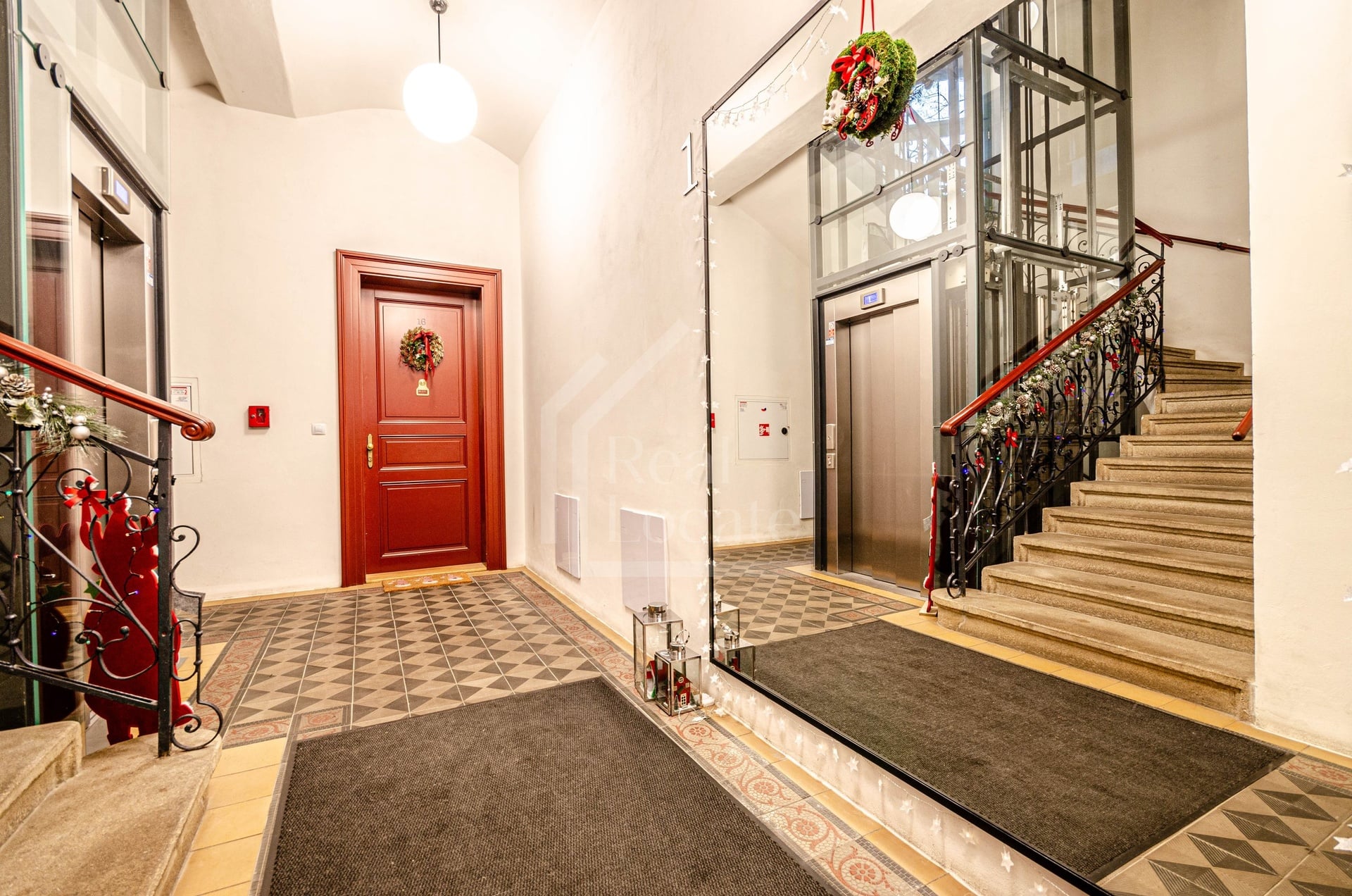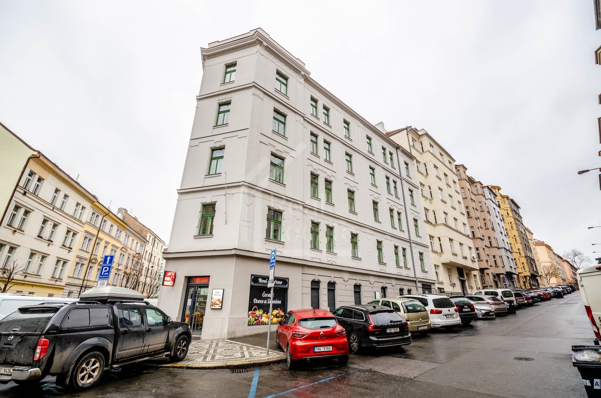 Предлагаем к продаже исключительную угловую трёхкомнатную квартиру с неповторимой атмосферой и прекрасным видом на главную достопримечательность района — церковь Святого Прокопа. Квартира расположена на 2-м этаже элегантного дома в стиле модерн, построенного в 1907 году по проекту известного архитектора Вацлава Фолтына.